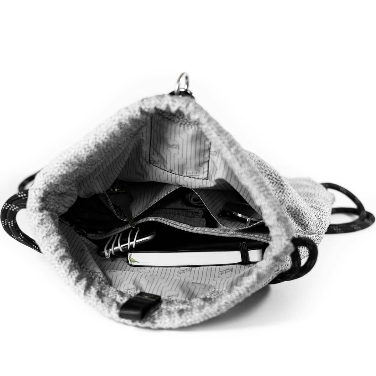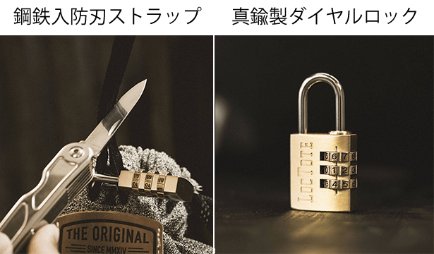 鋼鉄ワイヤ入防刃ストラップ+付属の真鍮製ダイヤルロック錠によるセキュアロックシステムが、貴重品を入れたFlak Sack SPORTをがっちりロックし盗難を防止します。