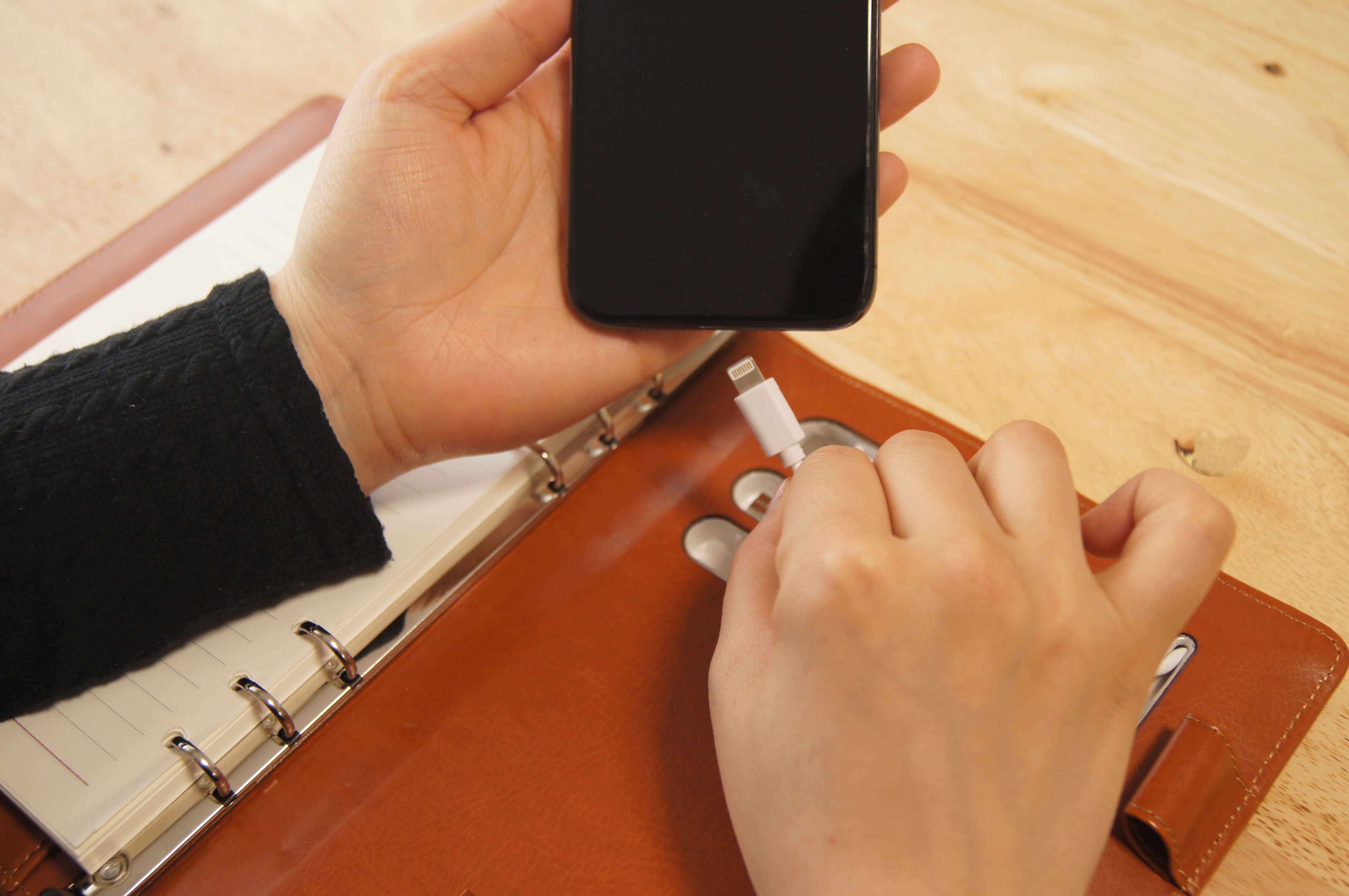 カバーの裏にあるLightningケーブルでiOS端末が、microUSBケーブルでAndroid端末やワイヤレスイヤホンなどの対応端末を充電することができます。Lightningケーブルは純正ケーブルを使用しています。