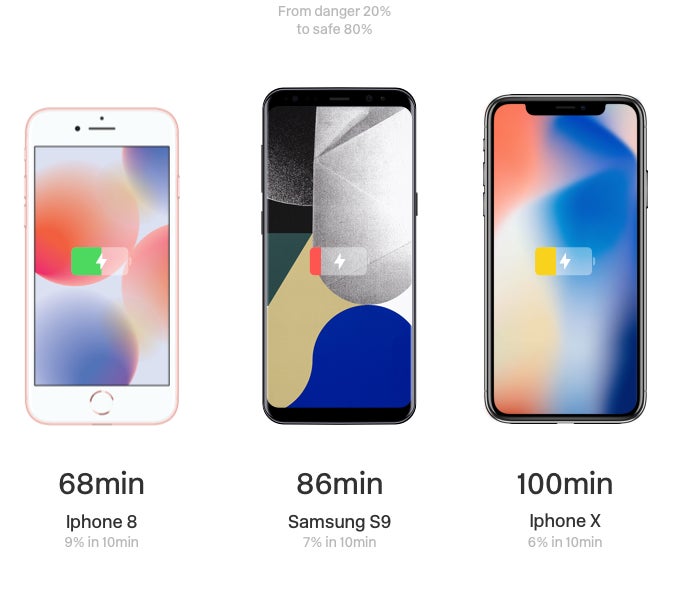 iPhone8なら68分、Samsung S9は86分、iPhoneXは100分でフル充電することができます。