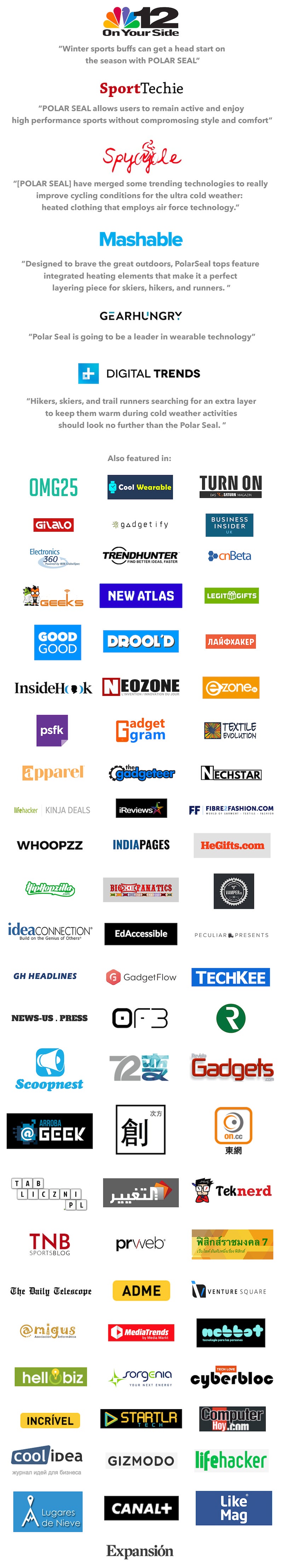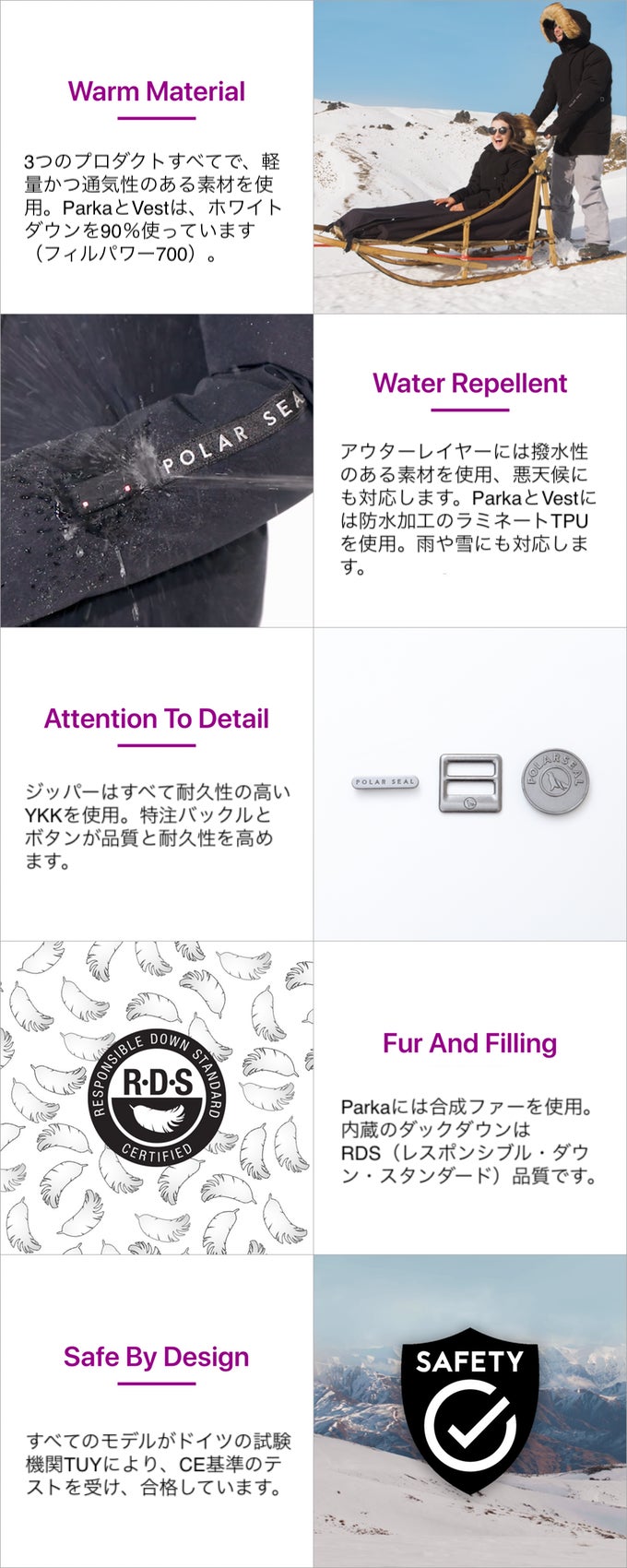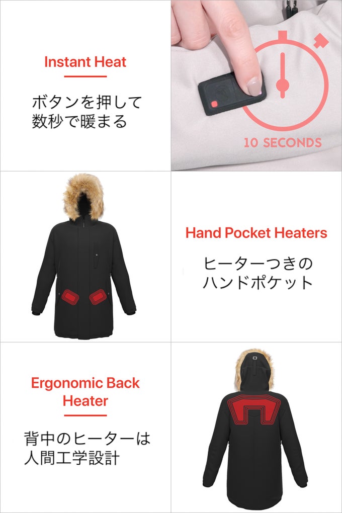 「Polar Seal(ポーラーシール)」は、ボタンを押すだけですぐ暖まる、ヒーター内蔵のウォームウェアです。超軽量で柔軟性に優れた保温素材を使用したParka(パーカ)、Vest(ベスト)、Hoodie(フーディ)は、スポーツウェアとしても街着としても快適に使うことができます。きっと「こんなに暖かいウェアがあったの!?」と驚かれることでしょう。