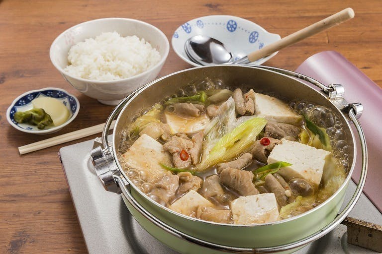 昭和40年頃、炭鉱に働きにきた人がホルモン鍋を提供する食堂を開業。スパイスの効いたその味が評判となり県内から多くの人が食べに訪れるようになりました。これが「いわいずみホルモン鍋」の起源です。このホルモン鍋は醤油味のスープに豚ホルモンと鶏肉、キャベツ、ネギと地元の豆腐が入っており、ニンニク、コショウといったスパイスが効いているのが特徴です。