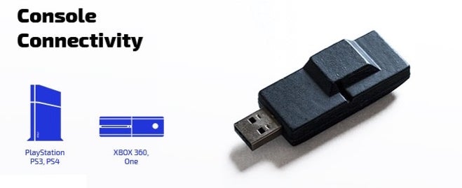 XBOX 360、XBOX One、PlayStation 3、PlayStation 4に対応するUSBドングル。(Nintendo Wii、WiiU、Switchにも対応予定)
