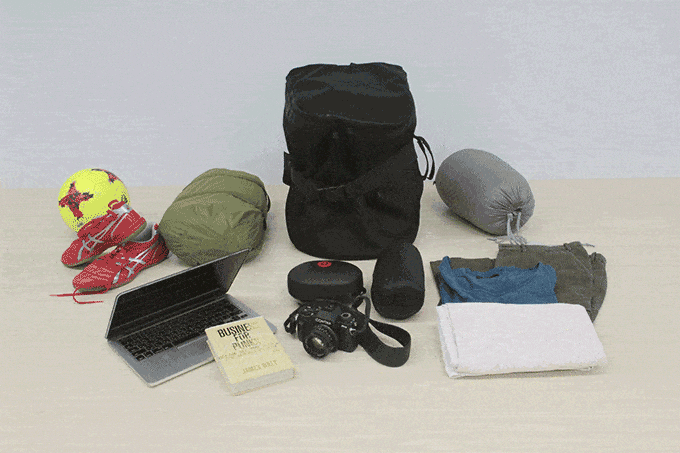 最大時の容量の際は3人用のテント、寝袋、衣類、バスタオル、ヘッドフォン、ノートPC、サッカーボール、サッカースパイク、厚めの書籍、カメラを入れてもまだ余裕があります。