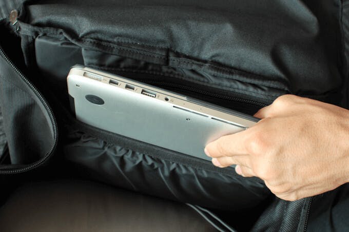 貴重品ポケットの背後には最大15インチクラスのPC用ポケットがあり、安心してノートPCを持ち運べます。大きなメインアクセスとも相まって出し入れしやすい設計にしました。