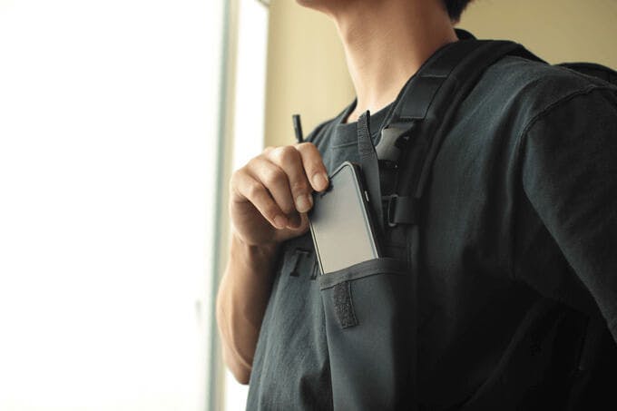 バッグの左のショルダーストラップにはスマホケースホルダーが付属しているため、バッグを背負ったままでもスマホにアクセスできます。