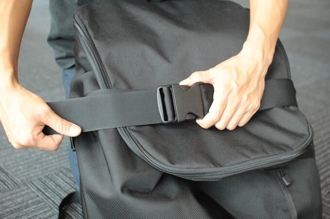 取り付け方法は本体ショルダー部のバックルと合体させ、前にもってくる場合はそのままストラップを短くすることで対応。後ろに取り付ける場合はストラップを伸ばし、ボストン持ちする際の持ち手部分を通すことで安定感が生まれます。