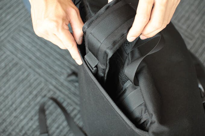 ショルダーストラップはバッグ背面のスペースに収納できます。サイドアクセス付近の持ち手により、ボストンバッグスタイルでも運用できる設計。