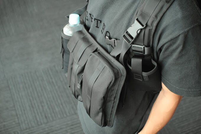 有料オプションのCHEST BAG "Pocketless bag”をバッグ本体のショルダーストラップに取り付けられ、前後どちらでも拡張バックとして使える拡張性があります。こちらの写真はフロント取り付け時のもので、すぐに取り出したいものをいれておくとサッと使えて便利です。