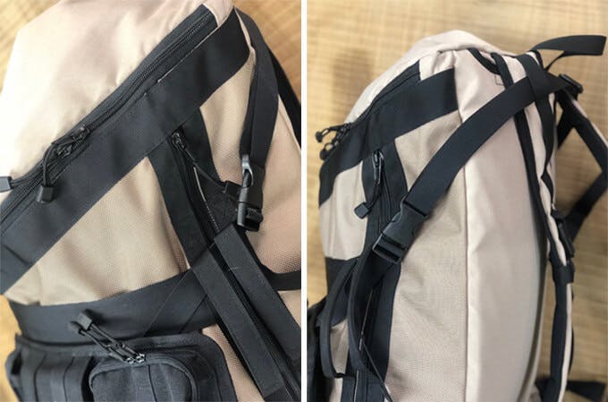 後ろに取り付けた場合はこのようになります。ペリカンバッグの大きな収納力とバックパックとしてのフロント部分の開放感はそのままに小物なども整理できます。