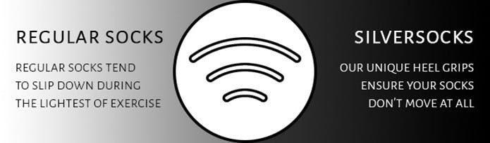 「SilverSocks」:かかと部分に付いている低刺激性シリコンバーがソックスの滑りを防止します。