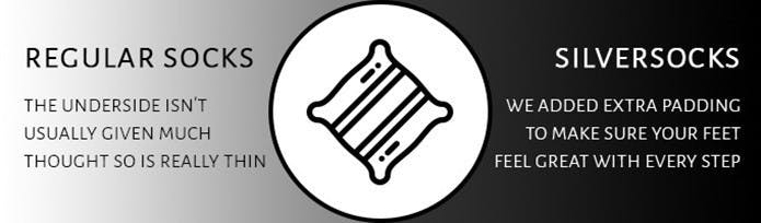 ソックスの足の裏部分だけわざわざ素材を変えているソックスは多くありません。「SilveSocks」は、ソックスを着用する人の全体重を受け止める足の裏部分にクッションを敷いて、歩くときの足の踏み心地を良くしています。