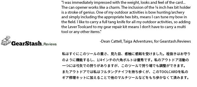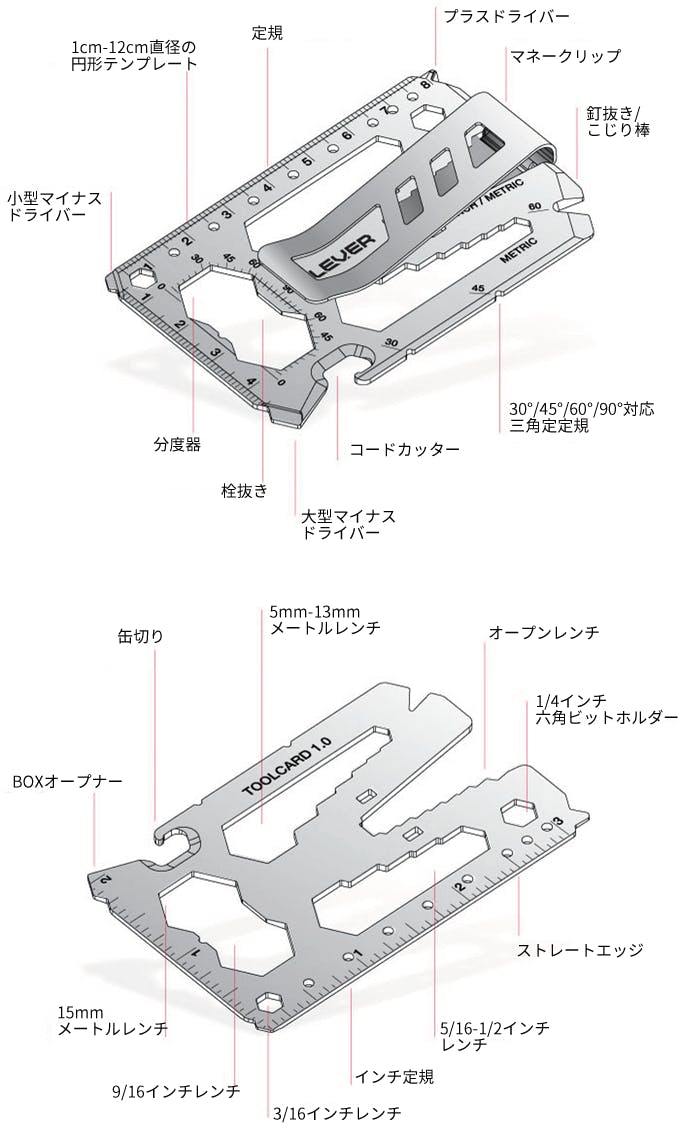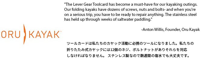 Lever Gear Toolcardは40個の機能を約28gのクレジットカードサイズに搭載した万能ツールです。財布に入れて常に持ち運んだり、Toolcard自体がマネークリップとして活用できるため、いつでも持ち歩けサッと取り出し作業を終わらせることができます。財布やバッグに必携の一枚となるでしょう。