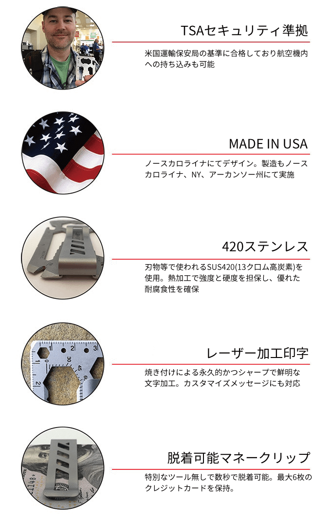 ツールカードはその名の通りわずか1.5mm厚さ、クレジットカードより少し小さいサイズで常時持ち運ぶに最適な大きさです。そしてコードカッターの刃はくぼみの内側に隠されているため、TSA準拠となり財布を傷つけることもなく、そして飛行機にさえ持ち込めます。