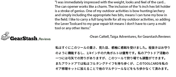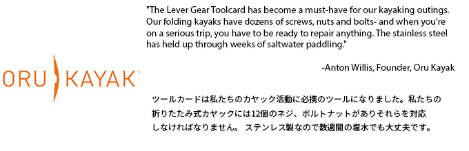 Lever Gear Toolcardは40個の機能を約28gのクレジットカードサイズに搭載した万能ツールです。財布に入れて常に持ち運んだり、Toolcard自体がマネークリップとして活用できるため、いつでも持ち歩けサッと取り出し作業を終わらせることができます。財布やバッグに必携の一枚となるでしょう。