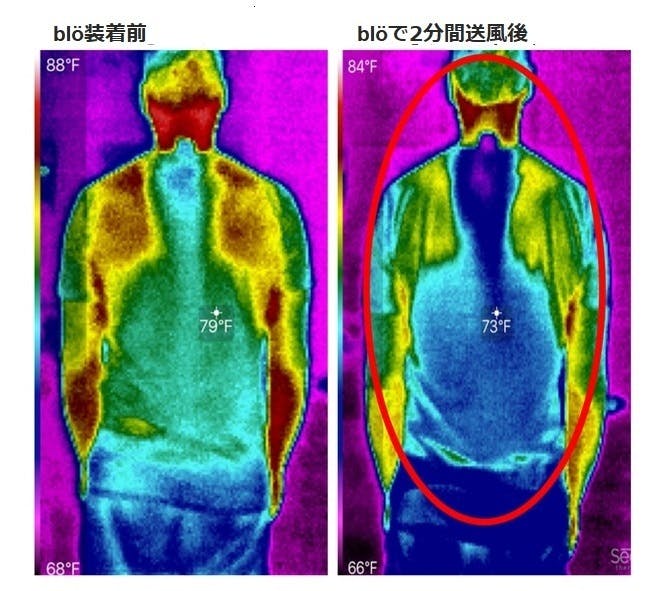 上記の画像でわかるように、blöを首の後ろに装着して2分間送風した結果、体表温度が79F(約26℃)から73F(約23℃)まで下がっています。クーラーとしてはとても効率的です。