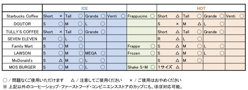 対応できるドリンクカップのサイズの目安 (自社調べ)