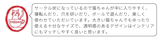 本体外側は曇りガラス状の加工を施し、猫ちゃんの爪や噛むことによる傷が付きにくく、また目立ちにくくなっています。逆にボールで遊ぶ内側はブライト加工(クリア加工)によって非常に透明度の高い処理となっています。これによって傷の付きにくさと遊び易さを両立しています。