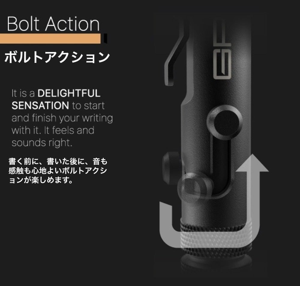 ペン先の出し入れには、適度な力で操作ができて、カチっという音と確かな感触を楽しめるボトルアクション機構を採用。この心地よい感触は確かな中毒性があります。