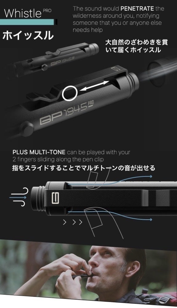 一般的なレスキューホイッスルは、シングルトーンの高音を出すだけで、風にかき消されやすいという難点がありました。GP 1945 ボルトアクションペンには、マルチトーンで最大100dBの音が出せるPROホイッスルが内蔵されています。指をスライドさせることで、さまざまな音色を出すことができます。