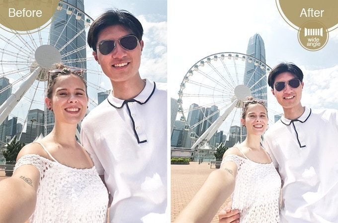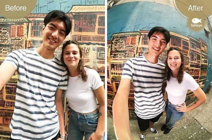 魚眼レンズで自撮りすると、さらに周囲の環境や全身をフレームに入れられます。