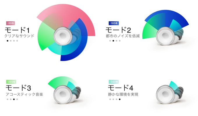 Knopsには4つのモードがあります。「モード1」では、通常どおり周囲の音をクリアに聞くことができます。「モード2」はノイジーな都市環境音を低減するために、「モード3」は音楽のボリュームをアコースティックに調節するのに最適です。「モード4」に切り替えれば、静寂の中で仕事に集中できます。