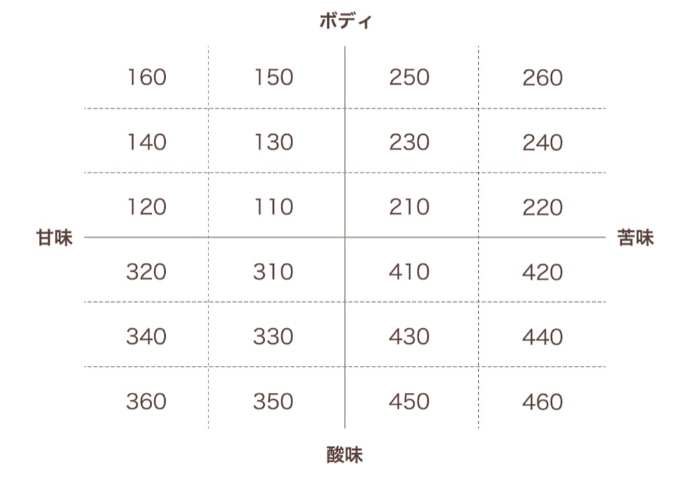 Cotteaでは、「甘味」「苦味」「酸味」「ボディ」の4つの軸で、味の違う24種類のコーヒーを準備しています。100番台(110〜160)は甘みとボディが特徴です。200番台(210〜260)は苦味とボディ、300番台(310〜360)は甘みと酸味、400番台(410〜460)は苦味と酸味が特徴となっています。