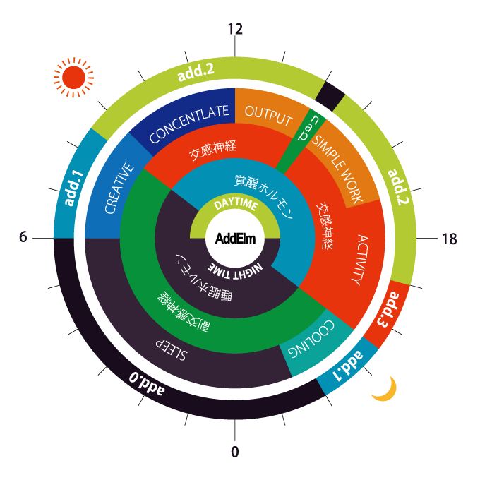 AddElmでは上記の生体リズム(脳内分泌物、自律神経の動き)に沿った製品開発をしています。より強度が求められる時には強い作用をする製品を。逆に睡眠時などの安静が求められる時には、より身体を休められる製品を。その強度を当社では”add.0 ~ add.3"の4段階で設計しています。