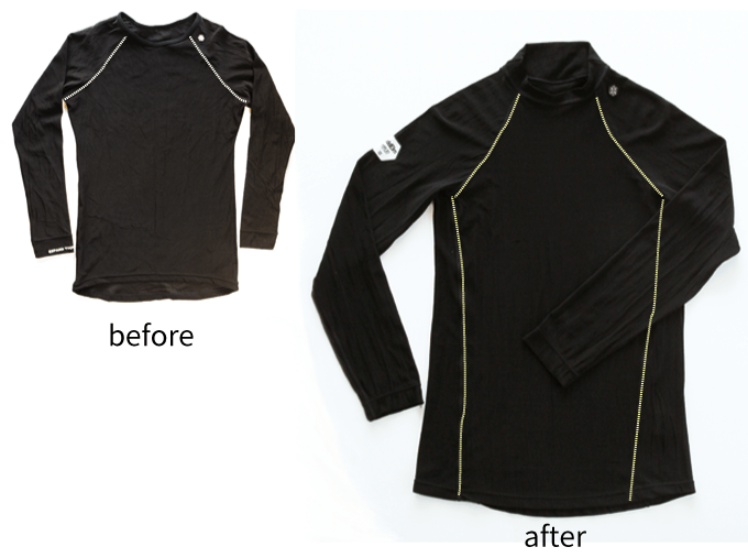 今回の製品は繊維全体が主にデイタイムの機能向上を目指す「add.02」になっていますが、そこにより効果UPとなる「add.03」レベルの転写マークを左肩に追加(ノースリーブは背中側首元に追加)。これによって更なる強度UPが見込めます。