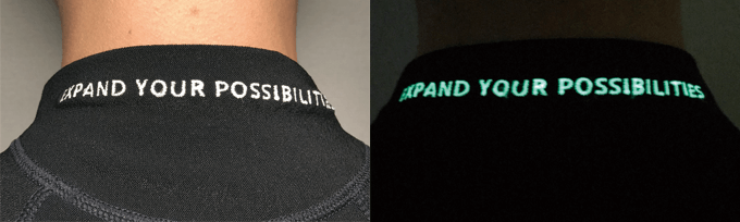 既存モデルから、襟周りのデザインをクルーネックから短めのスタンドカラーに変更。紫外線がきつくなる時期にむけて、より首回りの日焼け防止につながります。また刺繍部分は蓄光素材の為、夜間には発光して存在をアピールしてくれます。