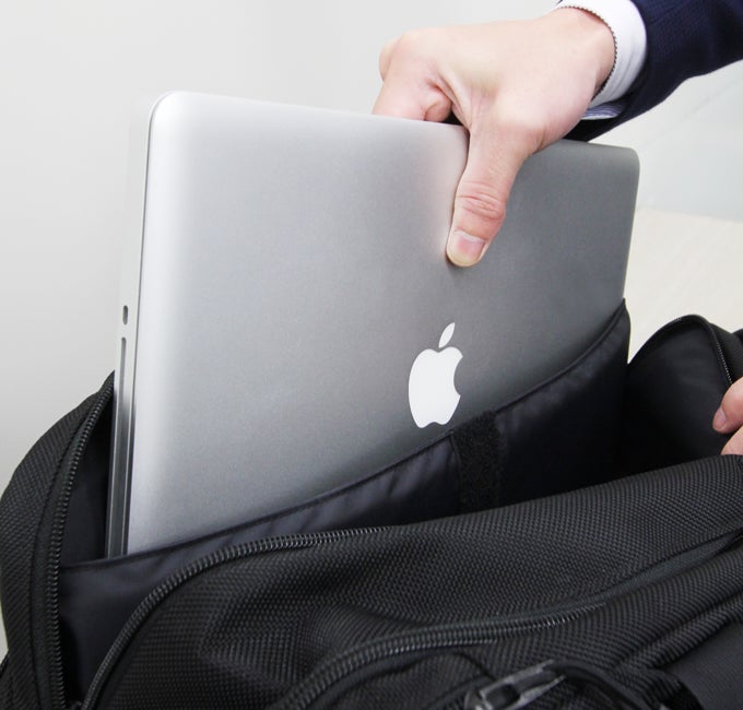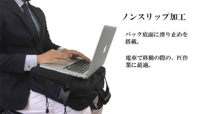 バッグ裏側に滑り止めシートがついているため、 電車の中でのPC作業中、バッグの落下を防ぎます。