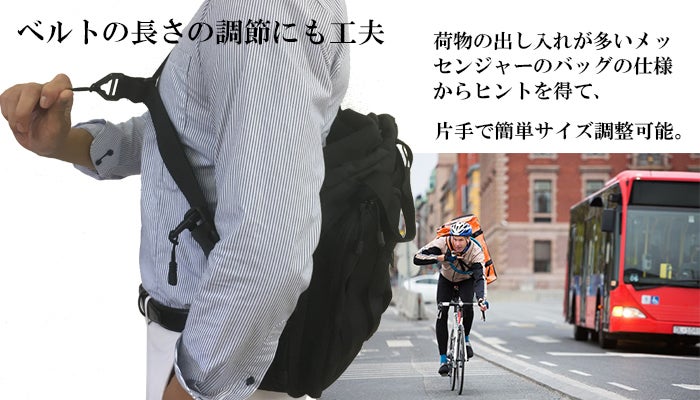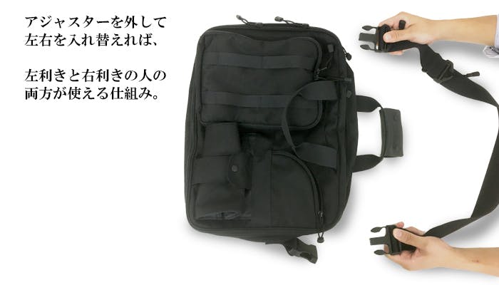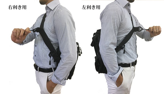 左利きでも右利きでも使える着脱式。ベルトの長さも、片手で簡単に調節可能。