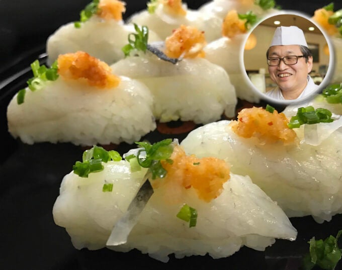 初年度はふぐの食文化がない地域に8000円代の高級鍋コースは敷居が高かった。しかし、美味しいものは絶対売れると、下関の回転すし店でとらふぐの寿司を食べたことを思い出し、よりカジュアルに体験できる回転すしの店でとらふぐ寿司をラインナップ。最初は店長にも反対されたが、試食させるとみんな旨いと大絶賛。ぜひ売ってみようとことになり、上身はニギリ寿司にし、皮は軍艦で流した。