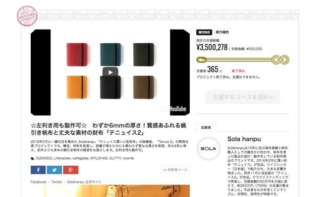 2016年11月:薄い財布の改良版「テニュイス2」のクラウドファンディングを実施。