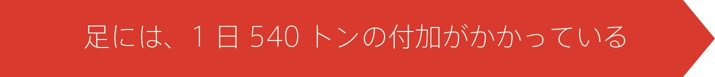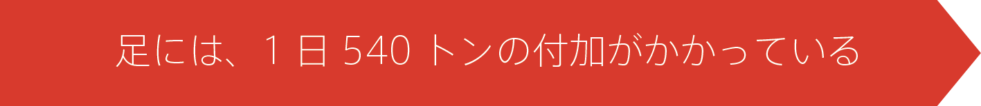 人間は1日に平均約6.5キロメートル、約7500歩歩いているといわれているので、単純計算すると1日540トン!急いで歩いたりすれば、もっと負担は大きくなり、腰痛につながる場合があります。知らない間に酷使している足をケアすることが、日々のパフォーマンスアップにつながります。