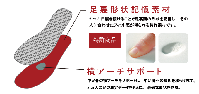 自分の足型になる形状記憶の特許素材を使用しており、2〜3日履き続けることで自分の足の形に形成されます。履きやすさはもちろん、足への負担を軽減して、日々のパフォーマンスをアップさせます。