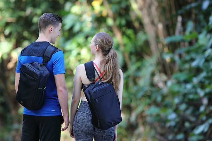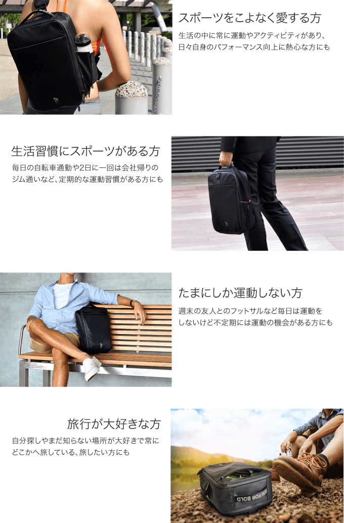 例えば皆さんもご経験があると思いますが、スポーツをする際には、財布、スマートフォンやタブレット、化粧品や着替え、靴、ボトルなどをすべて大型で扱いにくいバッグにまとめて入れるか、いくつかのバッグに分けて入れるかで解決してきたと思います。