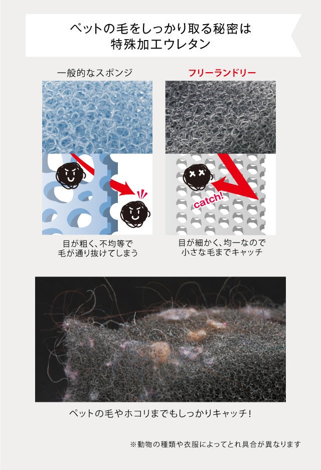 小さなゴミも通過させてはいけない現場で使用されてきたこのウレタンだからこそ洗濯機内で浮遊した動物の細い毛も余すことなく キャッチできます。
