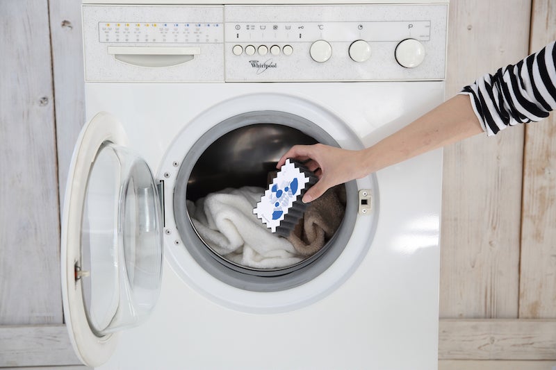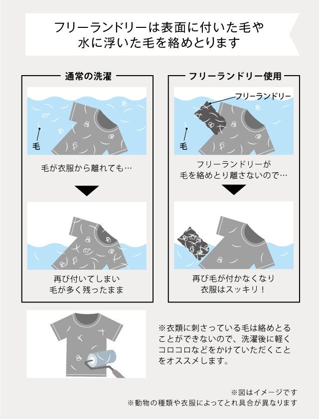 洗濯時フリーランドリーを入れ、一緒に洗濯するだけ。毛を絡みとります。