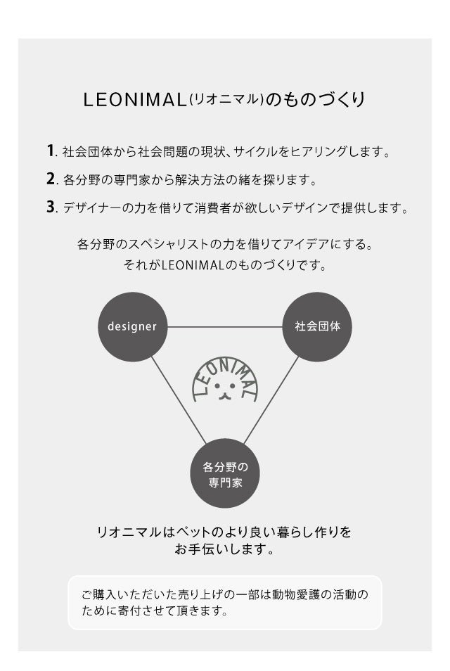 「動物に誠実な飼い主になろう」をコンセプトに動物との生活をオシャレで豊かで快適に過ごすためのライフスタイルグッズを提案するブランドです。LEONIMALは3つの理念に基づいて、ものづくり、情報配信をしています。