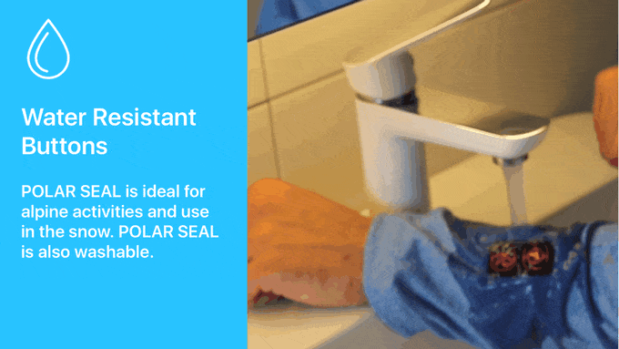 POLAR SEALのコントロールボタンは耐水仕様となっています。雪の中で遊んだり、雨の中でハイキングやジョギングをしても大丈夫。手洗いでの洗濯が可能で、洗剤もお使いいただけます。