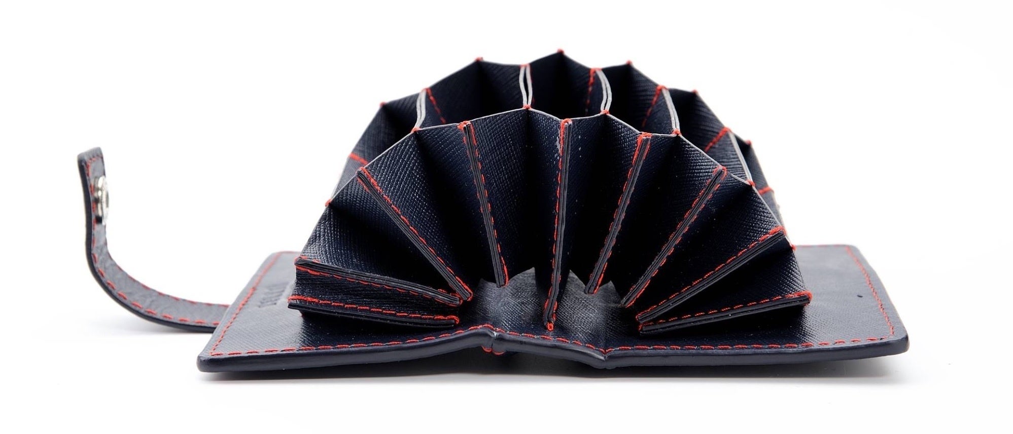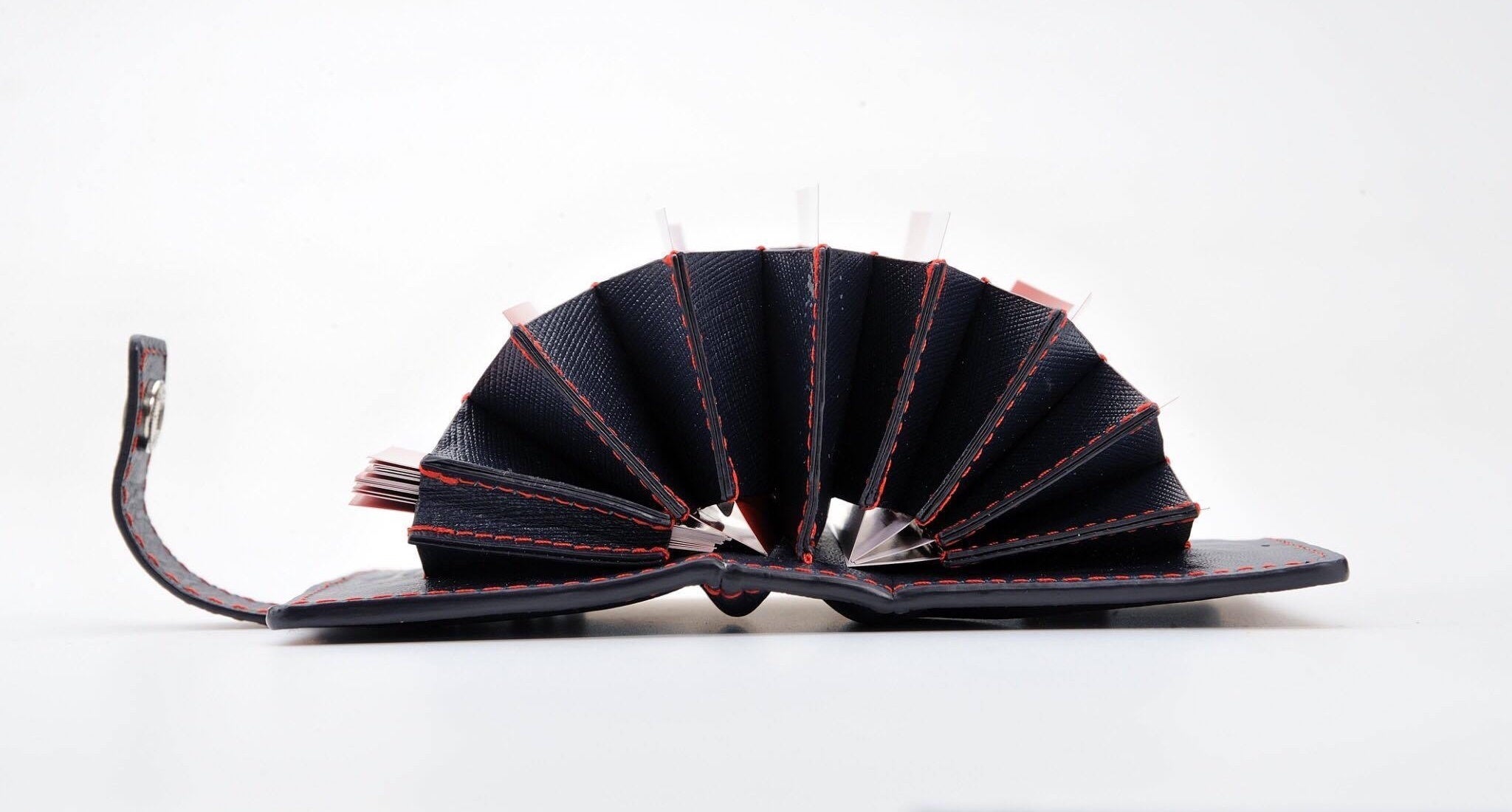 OUGIの最大の特徴は名刺の収納性と管理のしやすさです。収納部分に8箇所の仕切りをつけることで、収納部分を設けました。これにより収納枚数の多さはキープしつつ、名刺の仕分けが容易になり、開いた時のビジュアルも特徴的な形になりました。