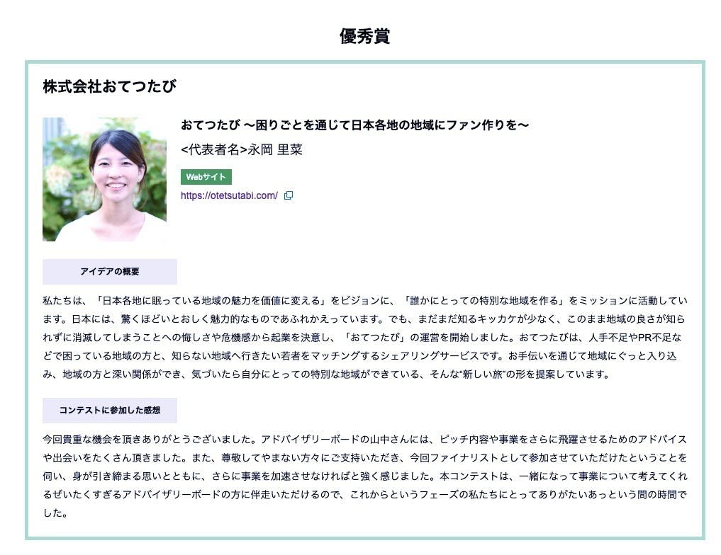 ファイナリストに選出いただいてから最終審査会までの間一緒に伴走頂いたアドバイザリーボードの山中さんには、頭が上がりません。一緒におてつたびの可能性を本気で信じてくださり、沢山のアドバイスを頂きました。。色々な方々の応援やご支援のおかげで、私たちは今ここにいます。