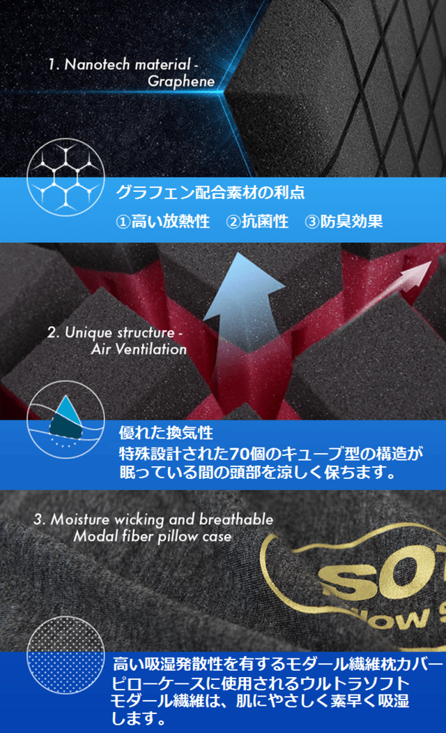 また、グラフェンという炭素素材を配合しており、一晩中使っても熱がこもることなく、細菌や臭いの発生も抑えてくれます。