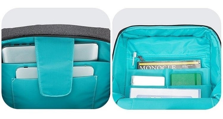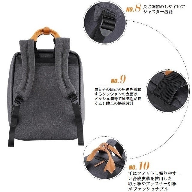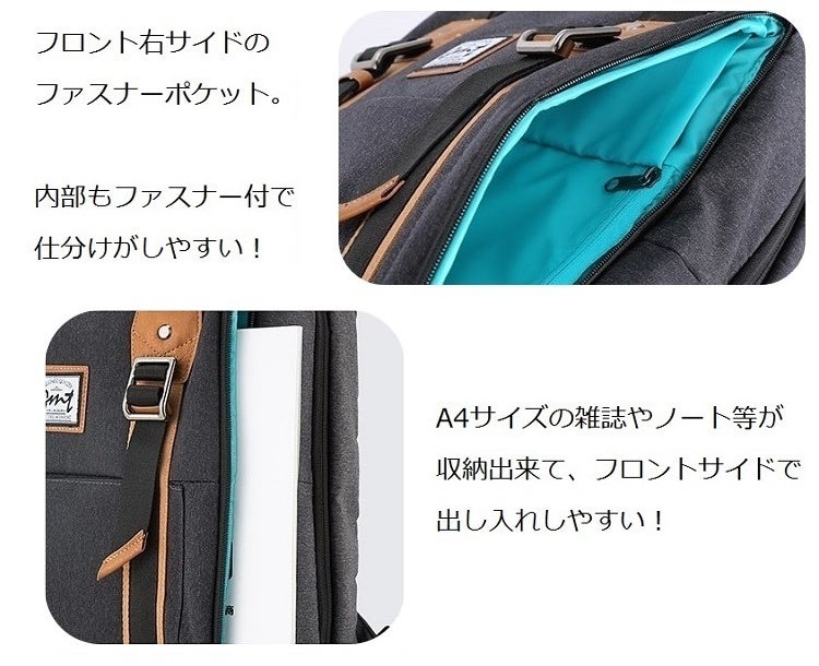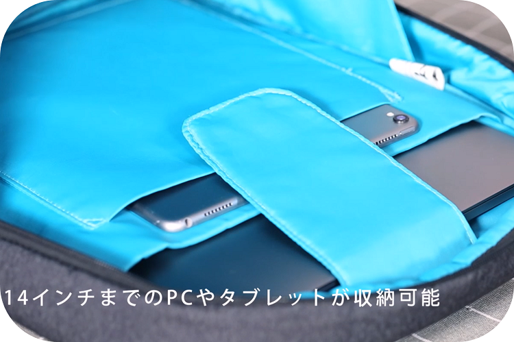 ラップトップPC用ポケットは14インチまでのサイズが収納可能。タブレット用ポケットとその他ファスナーポケットがあり、A4サイズのノート、電子手帳や小物用品など仕分け収納用ポケットも2つあり収納性抜群!