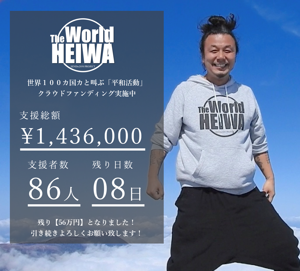 【 140万円を超えました!】 温かい応援ありがとうございます!! 支援額が140万円を超えました。86名もの皆さまからの応援、本当にありがとうございます!! https://camp-fire.jp/projects/view/126777 ~様々な応援メッセージを頂いてます~ 「わたしはもう、年齢的にも体力的にも海外には行けないので、 広島の被爆者の願いも乗せて、世界に届けてほしいと思います。 どうかよろしくお願いします。」 「最初は怪しい人がきたと思ったけど、直接お会いしてお話を聞いてるうちに、 森下さんのその笑顔と情熱にやられて、応援せずにはいられませんでした。 僕にできる事も協力するので、これからもがんばってください。」 プロジェクト終了まで、 【残り8日】となりました。 日本から、広島・長崎から始める、 この『平和づくりの輪』を、 1ヶ国でも多くで拡げていくためには、 残り約56万円のご寄付が必要です。 どうか引き続き、ご支援、シェアにて、 応援をよろしくお願いいたします! ▼日本から広島・長崎から、 『平和づくりの輪』を世界中に拡げたい! https://camp-fire.jp/projects/view/126777