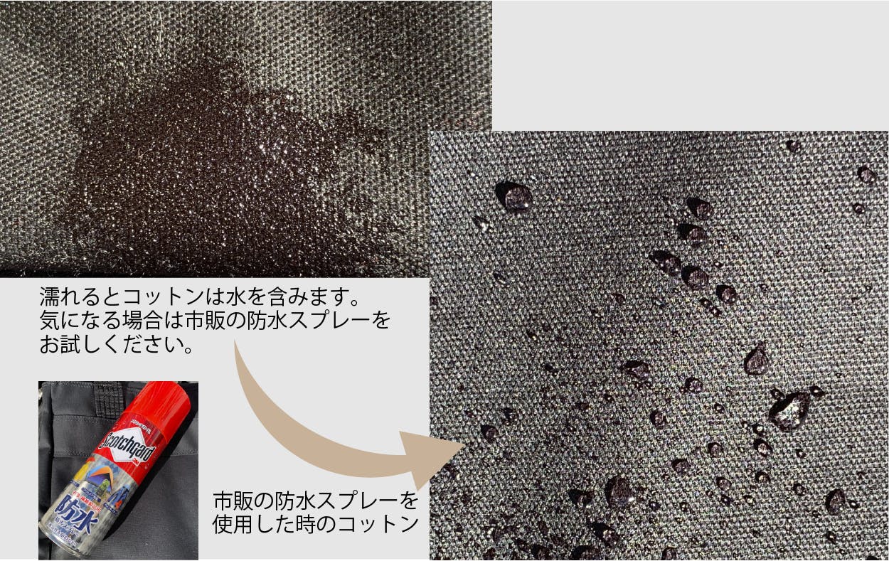 コットンですので市販の防水スプレーをご利用いただけます。濡れを防ぎたい場合はあらかじめ防水スプレーをかけてご使用されることをおすすめいたします。