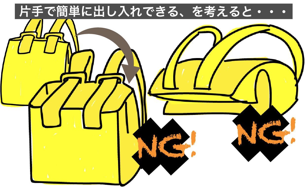 重たい袋を手で持つとき、男性は持ち手を握りますが、女性は腕にひっかける方がラク。女性と男性では腕の脂肪のつき方が違うからです。【TOKYO BACKTOTE】はユニセックスですから、そんな「女性持ち」に配慮し、持ち手は女性の腕が通せる長さにしました。