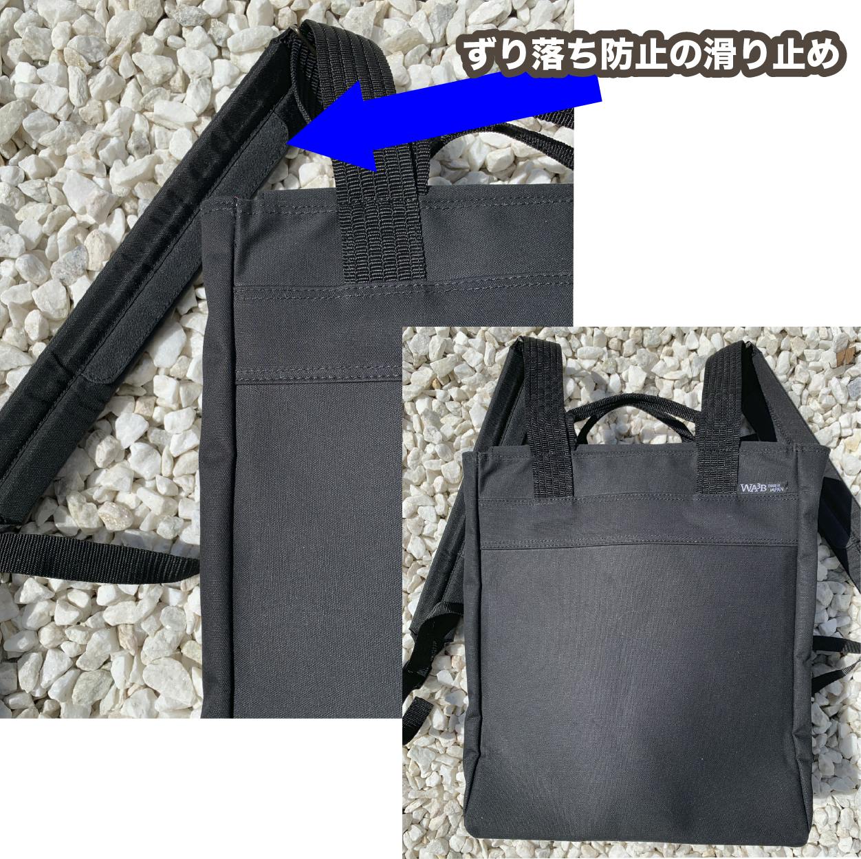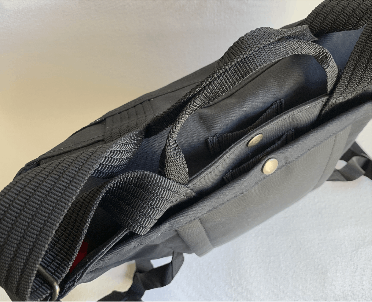 従来の背胴面(背中に当たる面)だけで袋全体を吊る構造では片手仕様にはなりません。背負った状態で袋本体に傾く力が働くため、口をしっかり閉める必要があるからです。背負うと形が崩れることがあるのも、この傾きに起因しています。