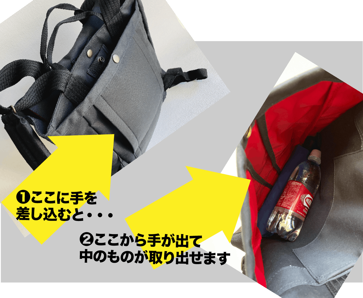 ●ペットボトル、折り畳み傘、スマホ等は、背に手を回しただけで取り出せる