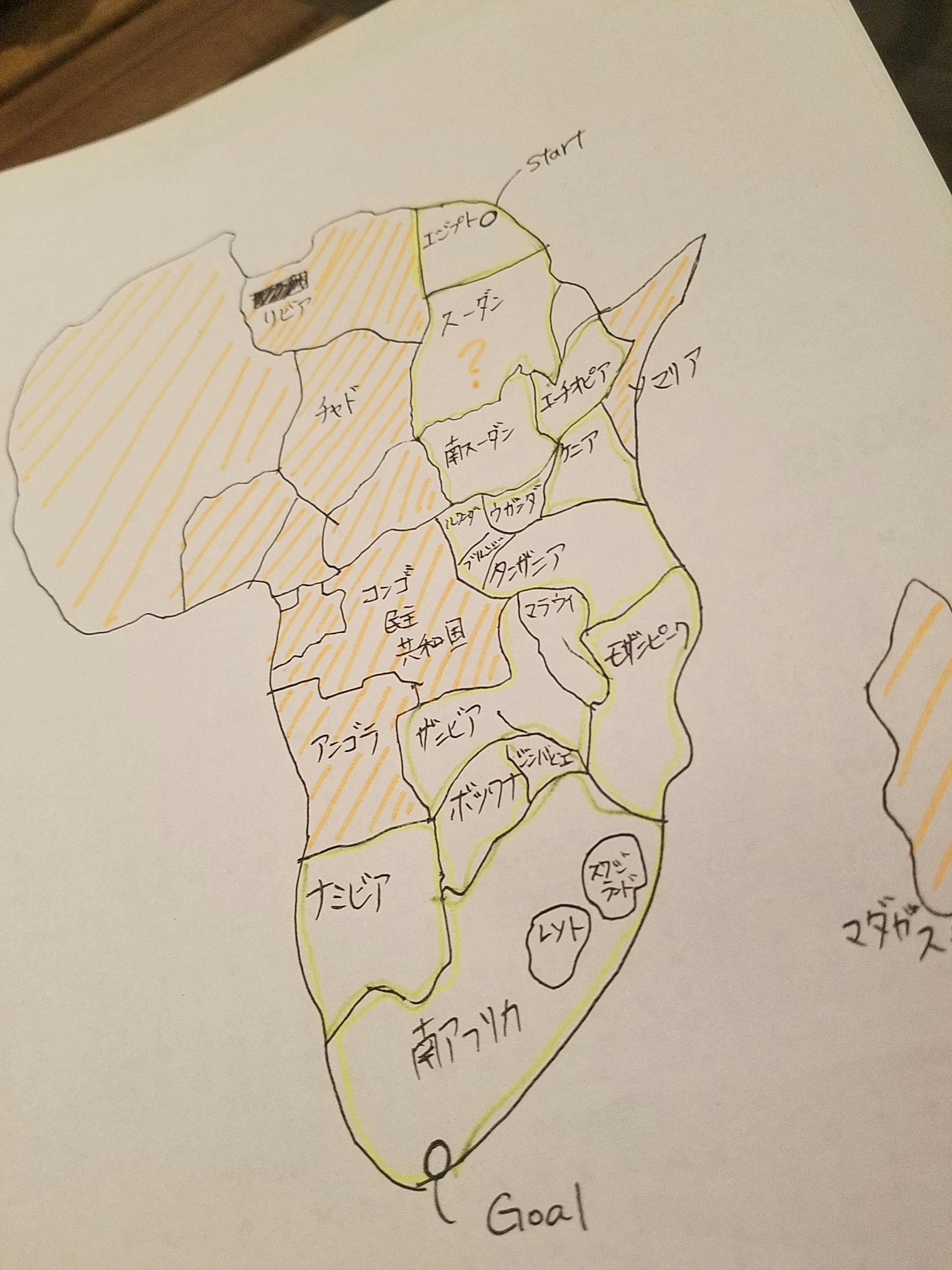 2019/02/20 14:53まずはじめは地図を書いてみました…全然うまくかけませんでした…オレンジで塗られてるところは基本行きませんが、スーダンだけまだ未確定です。黄色に塗られてるところはできるだけ通りながら行きたいと思っています!以上今現在の進行状況でした。 もっと見る